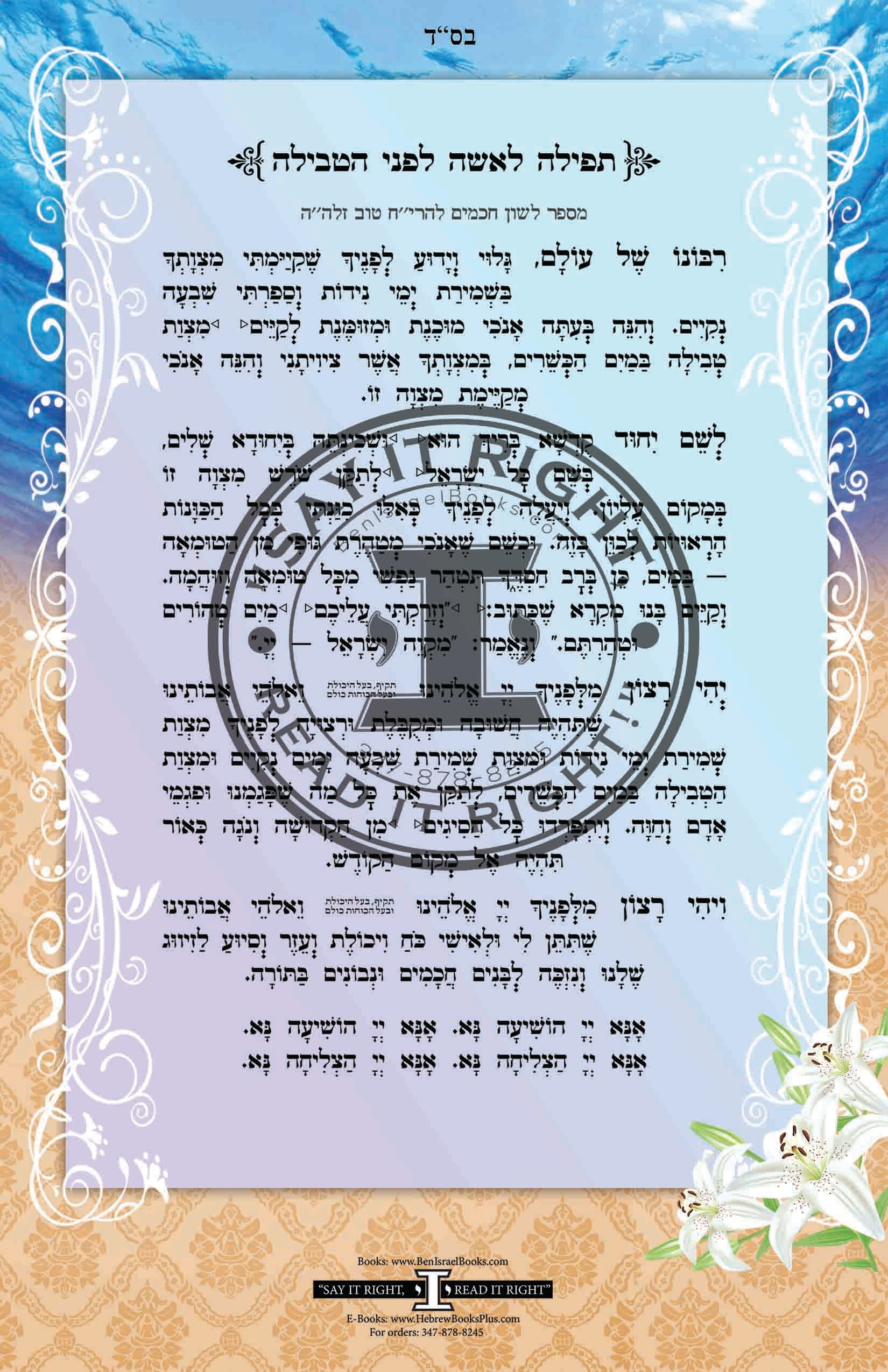 A Woman's Prayer Before Mikveh in Hebrew (Vertical, Laminated)
